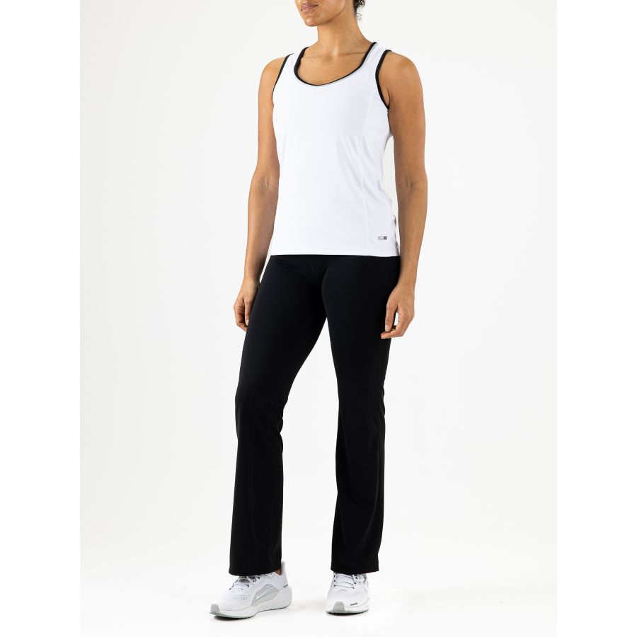 Modieuze dames singlet met een mooie hartvormige halslijn. Deze singlet is gemaakt van multistretch materiaal. Opvallende details zijn de contrasterende biezen langs de halslijn, de armopeningen en schuin langs de zijkanten van de body.